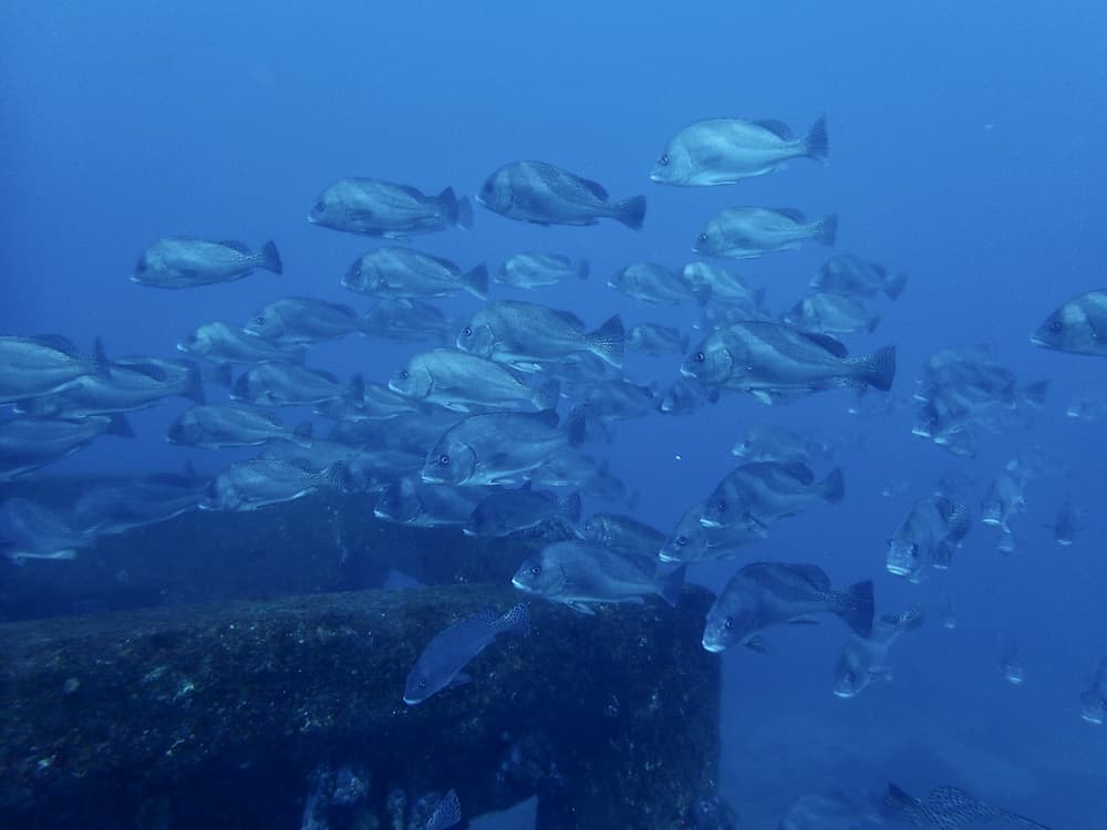 見通し良好で、まずはコショウダイの群れとまったり戯れ。